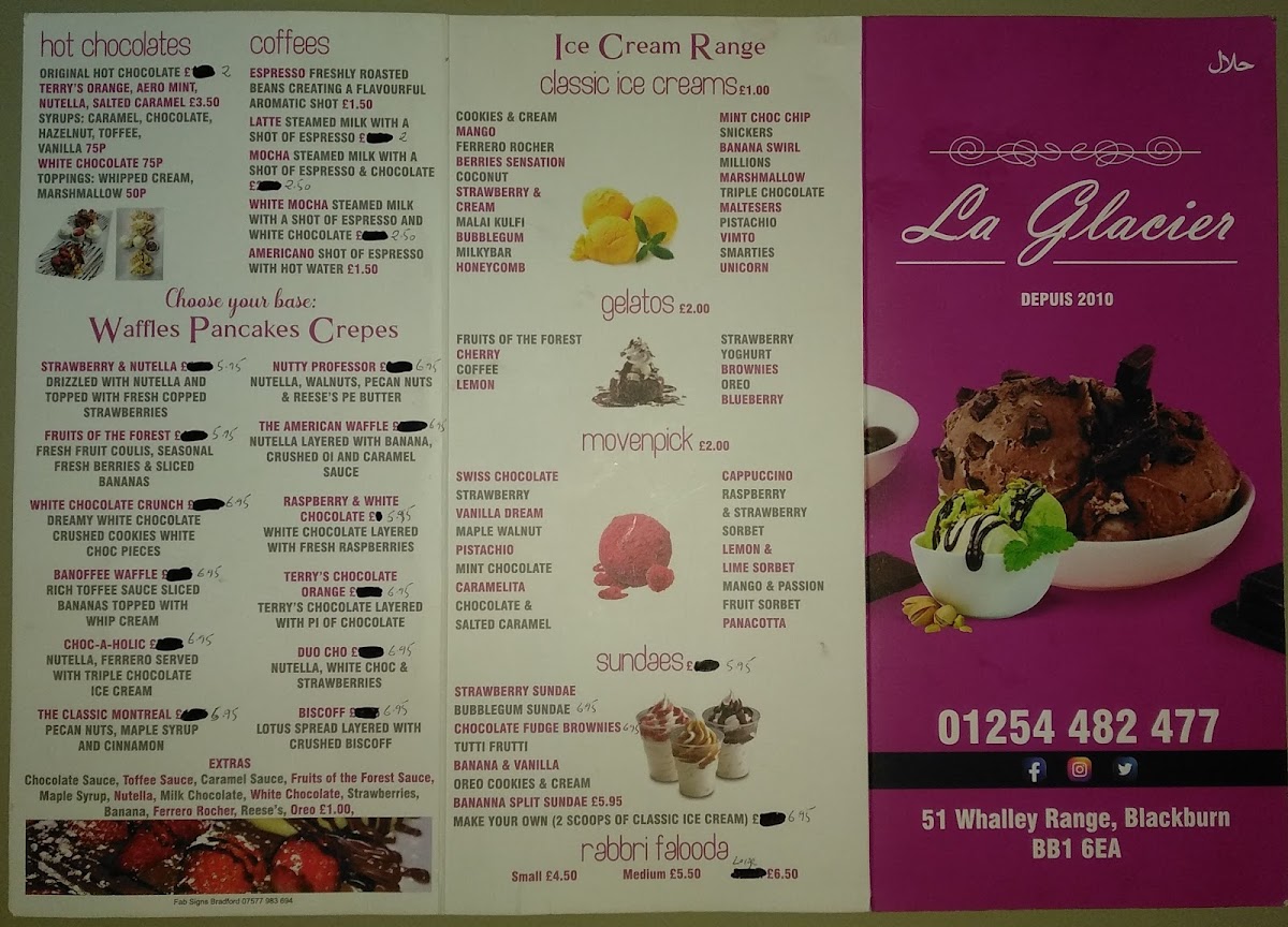 The menu at La Glacier Blackburn offers a diverse selection of desserts, drinks, and light meals suitable for breakfast, casual dining, and takeaway. The offerings include a variety of waffles, including options with strawberries, Nutella, and Banoffee flavors, alongside traditional items such as English Breakfast and Thali meals.